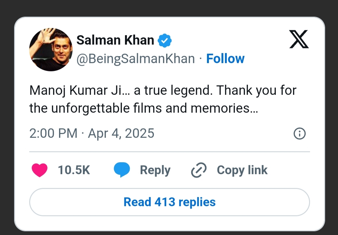 “मनोज कुमार जी… एक सच्चे लीजेंड। आपकी अविस्मरणीय फिल्मों और यादों के लिए धन्यवाद….”